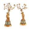 alternately with an infant satyr and Bacchanalian female infant, after Clodion, issuing floral branches, on circular bases mounted with Sèvres style bleu celeste and gilt floral panels, on a quadripartite base