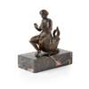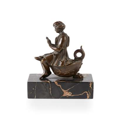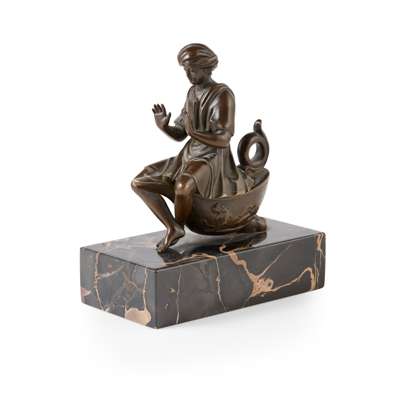 dark brown patination, modelled as a young man in a turban and robe seated astride an oil lamp, warming his hands above the wick, the lamp with a scene of a satyr and satyress, set on a rectangular Nero Portoro marble plinth