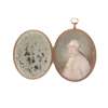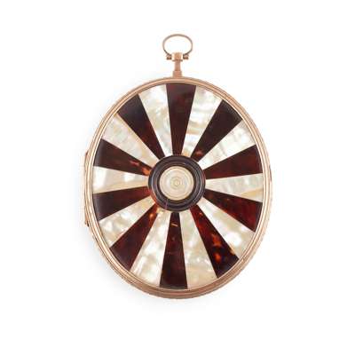 oval, on ivory, after the original by Joseph Boze, painted with watercolours and bodycolour, the sitter wearing a mauve and gold embroidered coat and the Order of the Holy Spirit, signed indistinctly, in an unmarked gold locket frame with tortoiseshell and mother-of-pearl covers, mirror interior, and a suspension loop