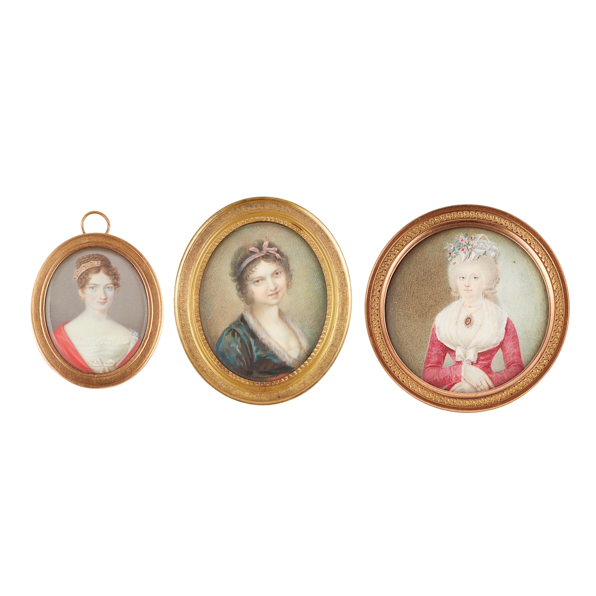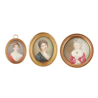 all watercolour and bodycolour on ivory, the first an oval portrait of Constance Mayer, the second a small oval portrait of the Duchesse Marie Louise de Parma; the third a circular portrait of French noblewoman, all in gilt metal frames