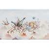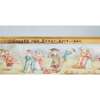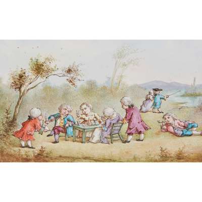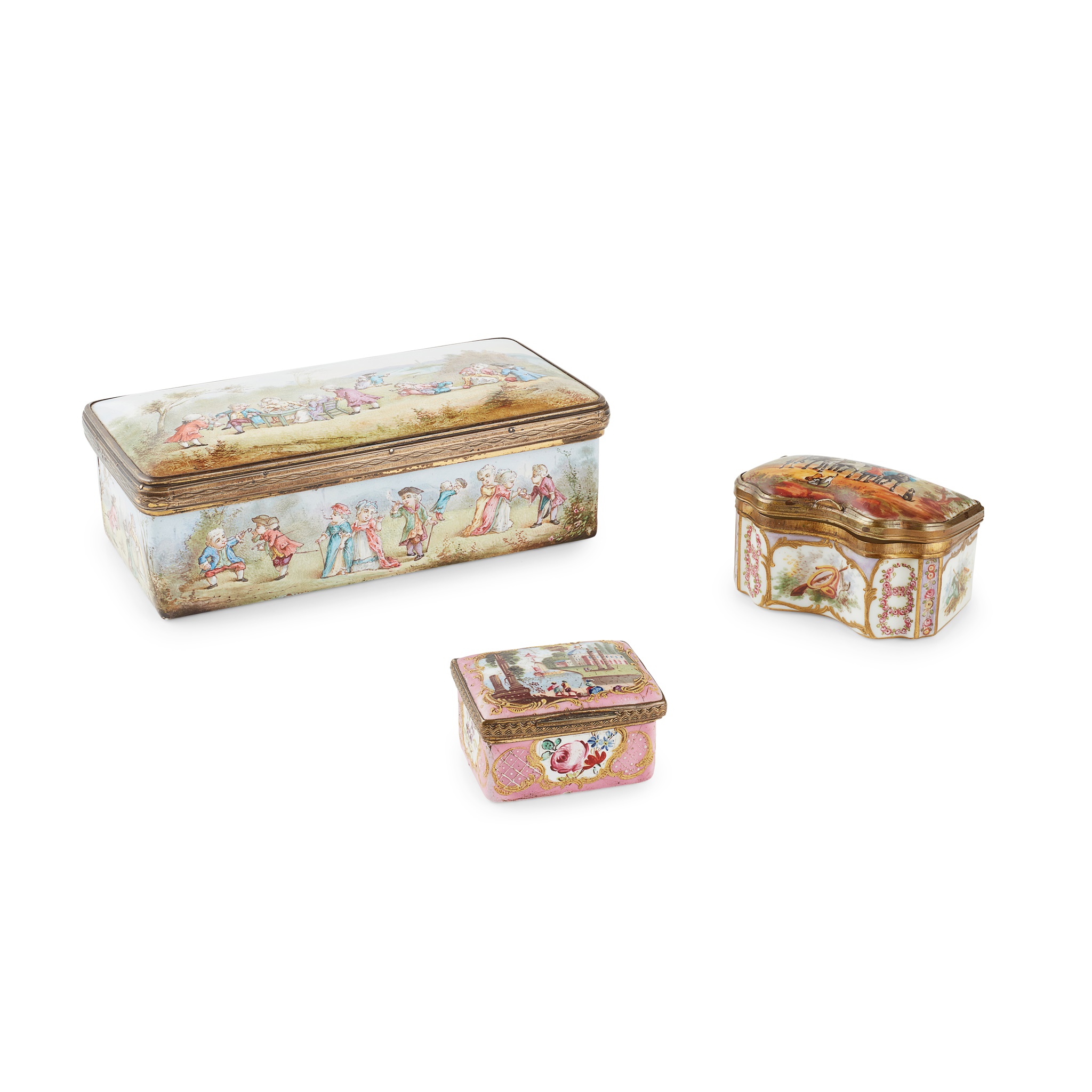 of rectangular form, the hinged cover and sides with scenes of ladies and gentlemen smoking and drinking, the interior and base painted with further smoking theme vignettes, with silver gilt mounts inscribed 'Gratty From Bunny . Novr . 1883', and retailer's inscription 'Paris 23 Bt des Capucines JONES & 41 St James's St . London', 16.5cm wide, 5.5cm high, 8.5cm deep; together with a CONTINENTAL PORCELAIN BOX, the hinged cover painted with an equestrian scene, the sides with various vignettes alternating with floral garlands, within metal mounts, underglaze blue, 7.3cm wide, 4.8cm high; and a BATTERSEA ENAMEL PILL BOX, the cover painted with a quayside scene within a scrolling cartouche on a pink ground, the sides with floral and diaper panels, the base with a gilt diaper design, within a metal mount