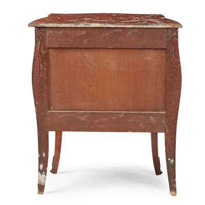 in the Louis XV style, the serpentine Rouge Griotte marble top with a moulded edge above three long drawers with floral marquetry, raised on slender cabriole legs with gilt bronze mounts