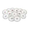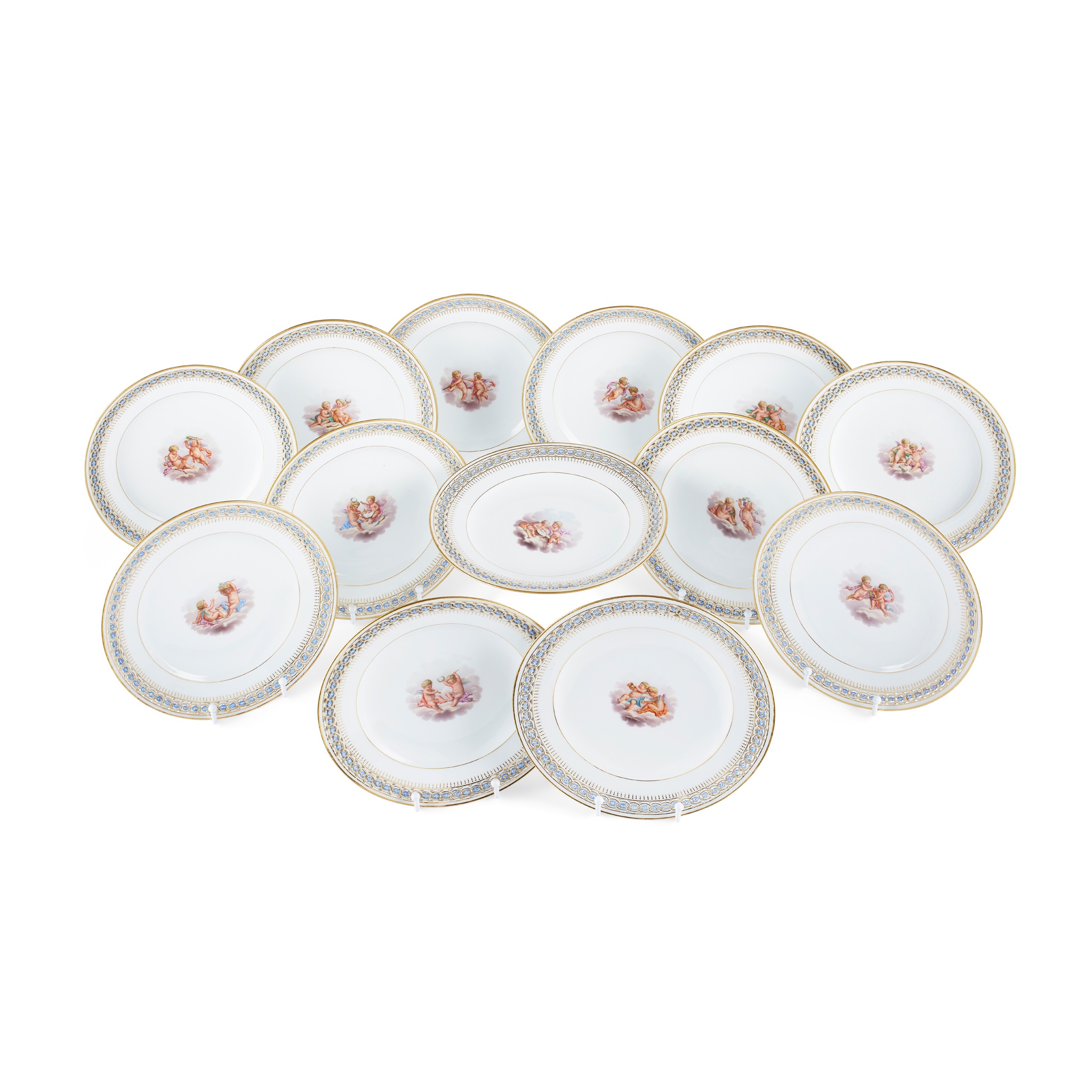 with a pierced rims decorated with forget-me-nots within a gilt chain border, centrally painted with a pair of putti amongst the clouds, engaged in various pursuits; comprising one tall comport and twelve plates, underglaze blue crossed swords mark