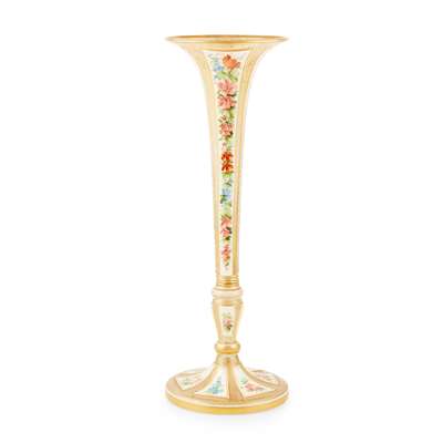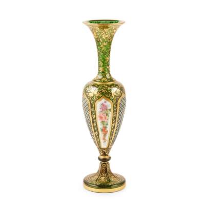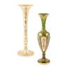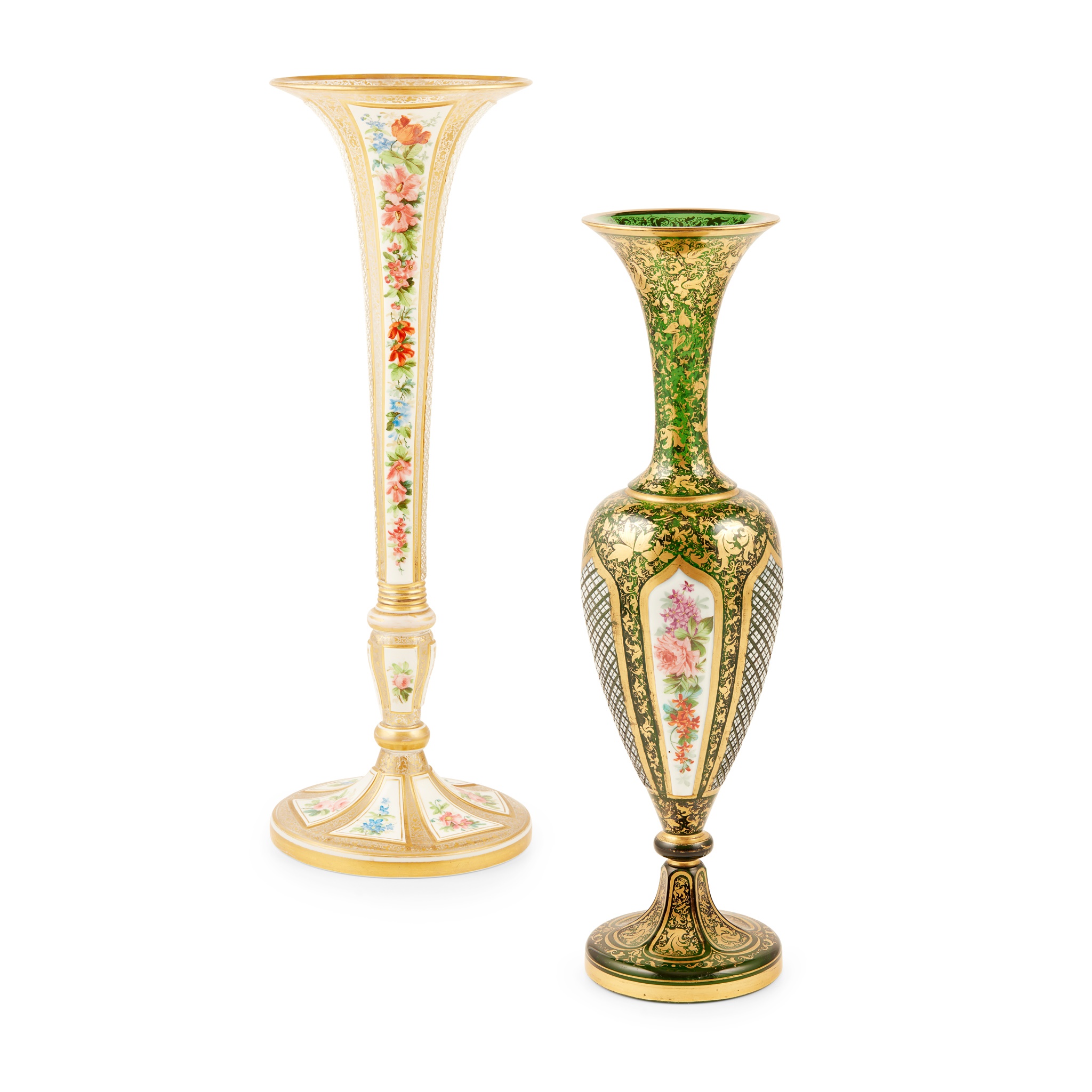 one of tall trumpet form in clear glass overlaid in white, the body with enamelled floral panels alternating with diaper cut panels, embellished with gilt scrolling designs, on a circular foot, 47.5cm high; the other vase of baluster form with a flared neck, in green glass overlaid with white panels, the panels enamelled with flowers alternating with diaper cut panels, embellished with gilt foliate designs, on a circular foot, 34.5cm high