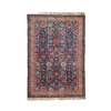 of Kuba style, the indigo field with allover rosette medallion and arabesque vine pattern, within red/pink border