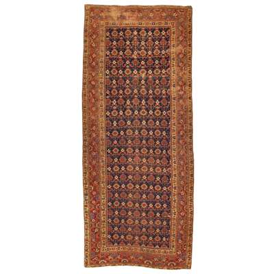the indigo field with allover rosette lattice pattern, within rust red border