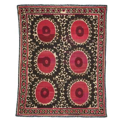 the cream field with six large purple rosettes, dark brown scrolling surrounds, within similar border