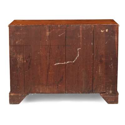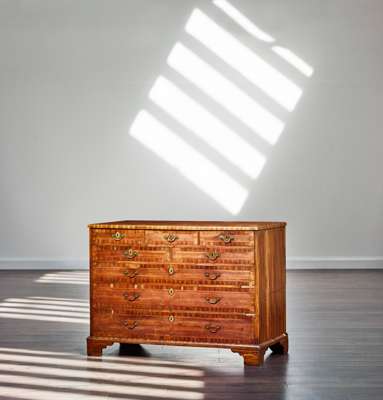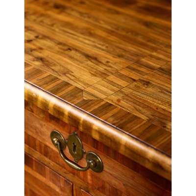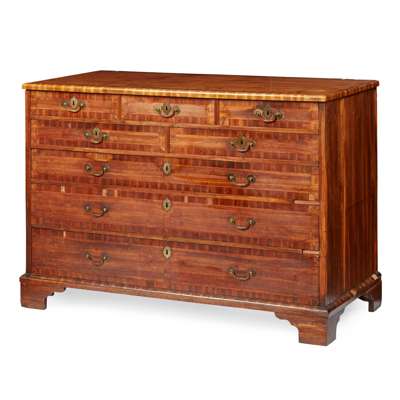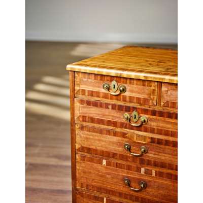 Note: This remarkable and rare example of a Scottish chest of drawers is most likely the work of George Sandeman (1724-1803) a Perth based cabinet maker. It is veneered entirely in Scots broom, a wood relatively unheard of outside of Scotland, and highly unusual to be found on such a substantial piece of furniture. The chest’s carcass is made of oak, consistent with known pieces by Sandeman, and the drawers still retain their original blue sugar paper linings, a feature specified in the ‘Edinburgh Cabinet Makers’ Book of Prices’, 1805. The chest’s form with three short drawers above others is also a characteristic typically associated with Scots furniture.