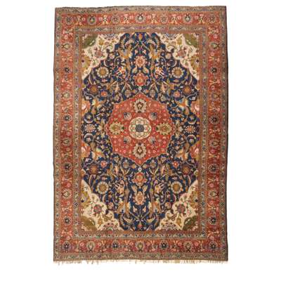 the indigo field with rust red medallion, cream and olive spandrels, within rust red border