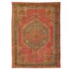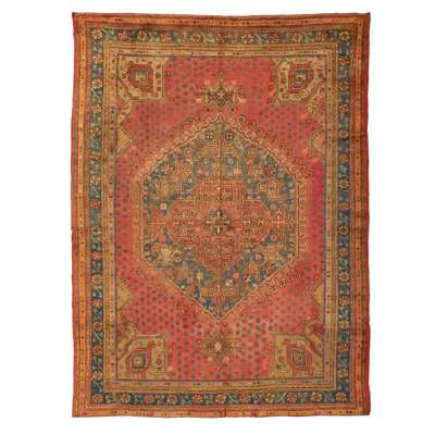 the light red field with large indigo and red medallion, olive spandrels, within narrow indigo border