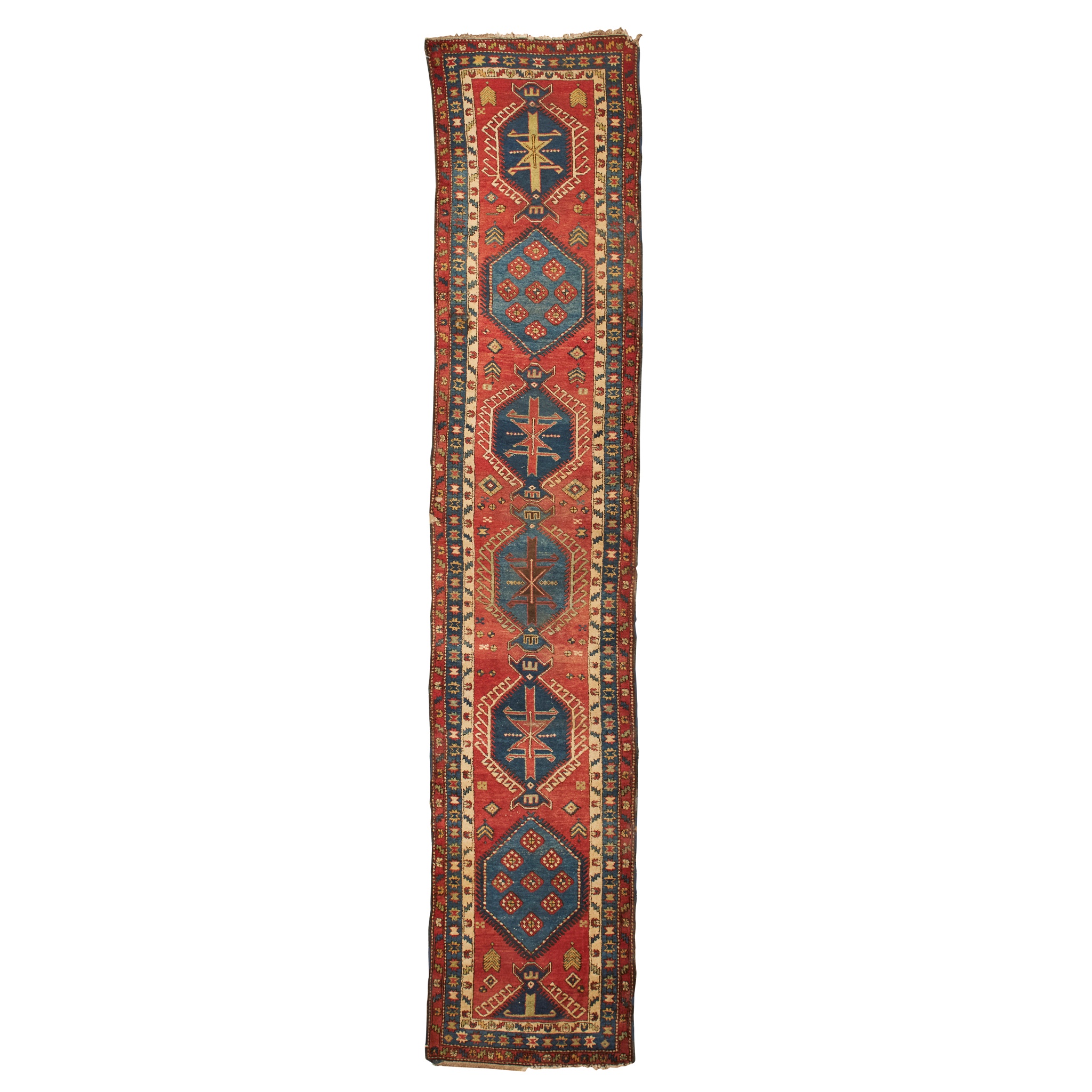 the red field with column of indigo medallions, within triple ivory, indigo and red borders