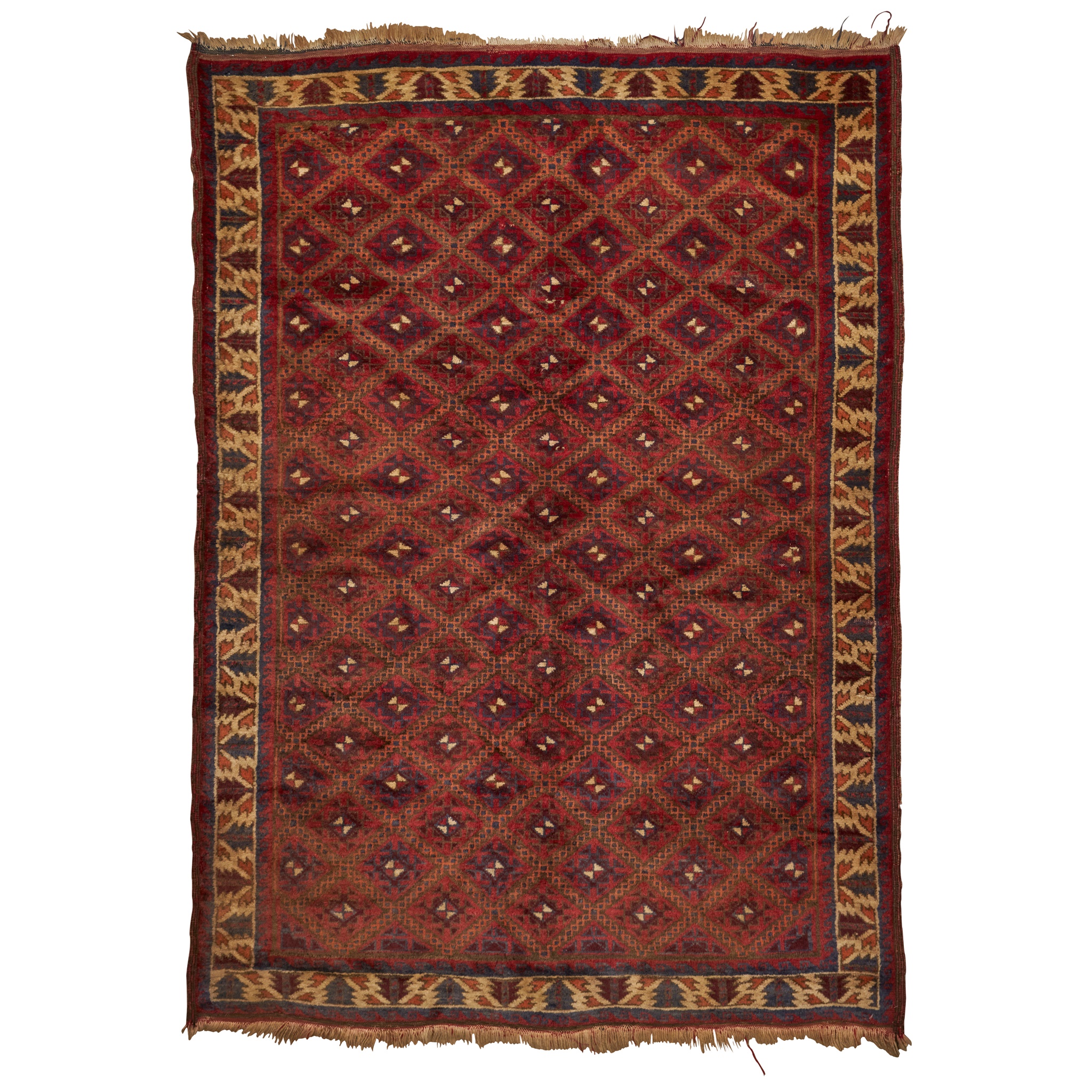 the red field with allover lozenge lattice pattern, within cream border