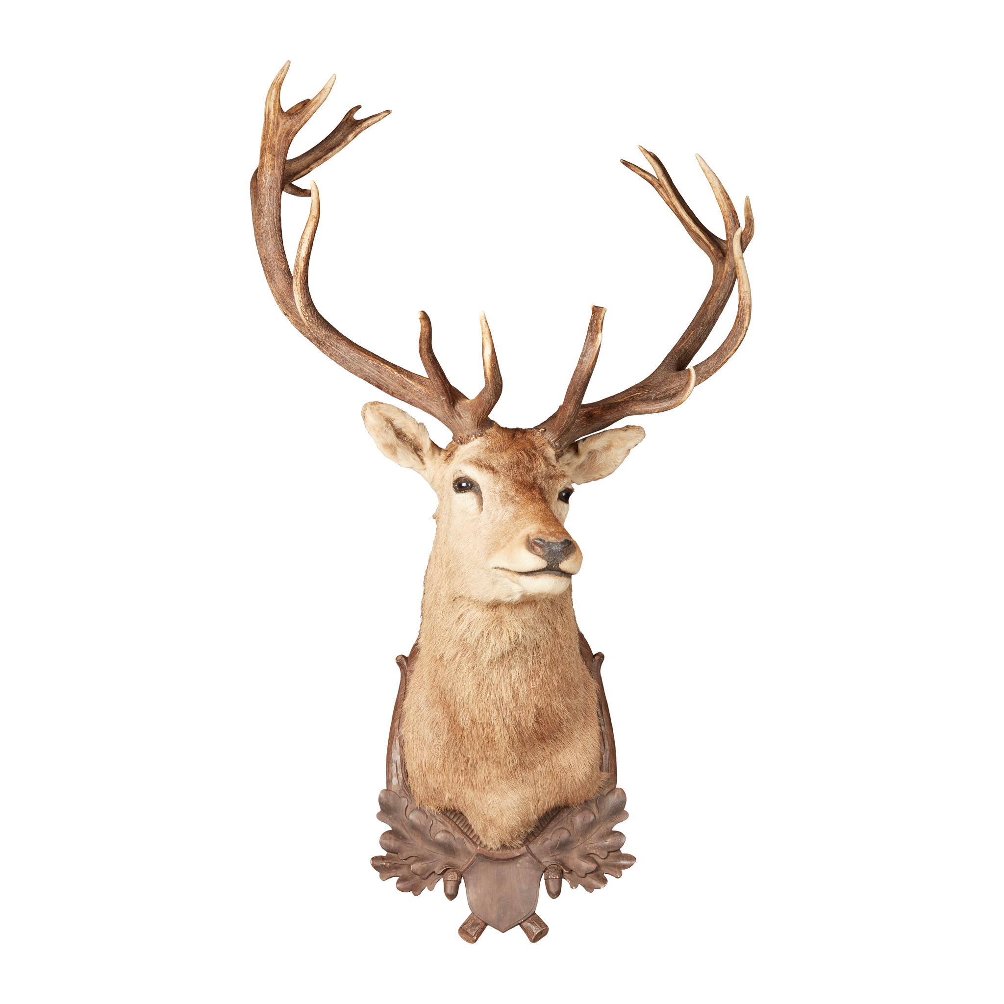 shoulder mount with eighteen points, mounted on a carved Black Forest style shield