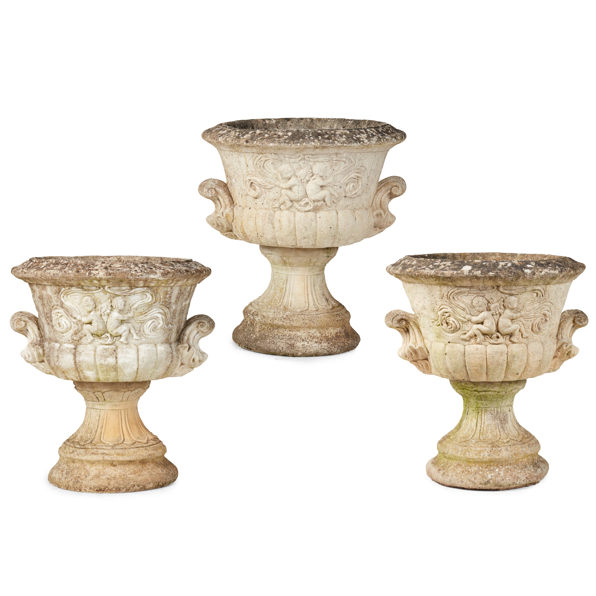SET OF THREE COMPOSITION STONE GARDEN URNS