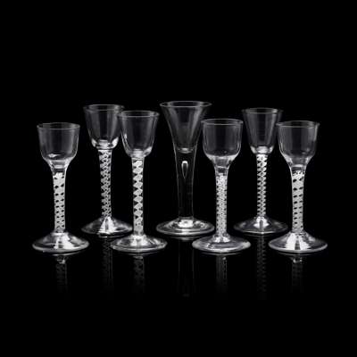 three with an ogee bowl, three with a round funnel bowl, 14.6cm high - 16cm high; together with a PLAIN STEM GLASS with a single tear and flared trumpet bowl, 15.8cm high