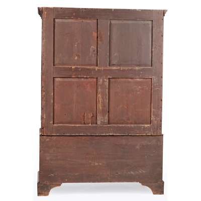 the moulded cornice above a pair of panel doors opening to a later fitted interior with sliding trays and hanging space, the base with two short over a long drawer, raised on bracket feet