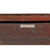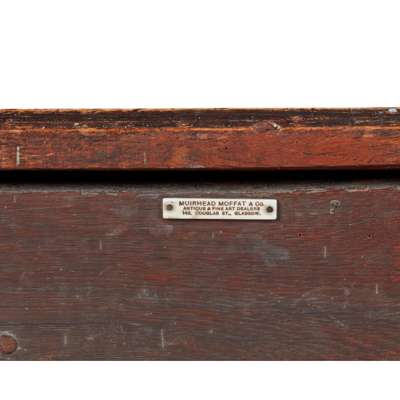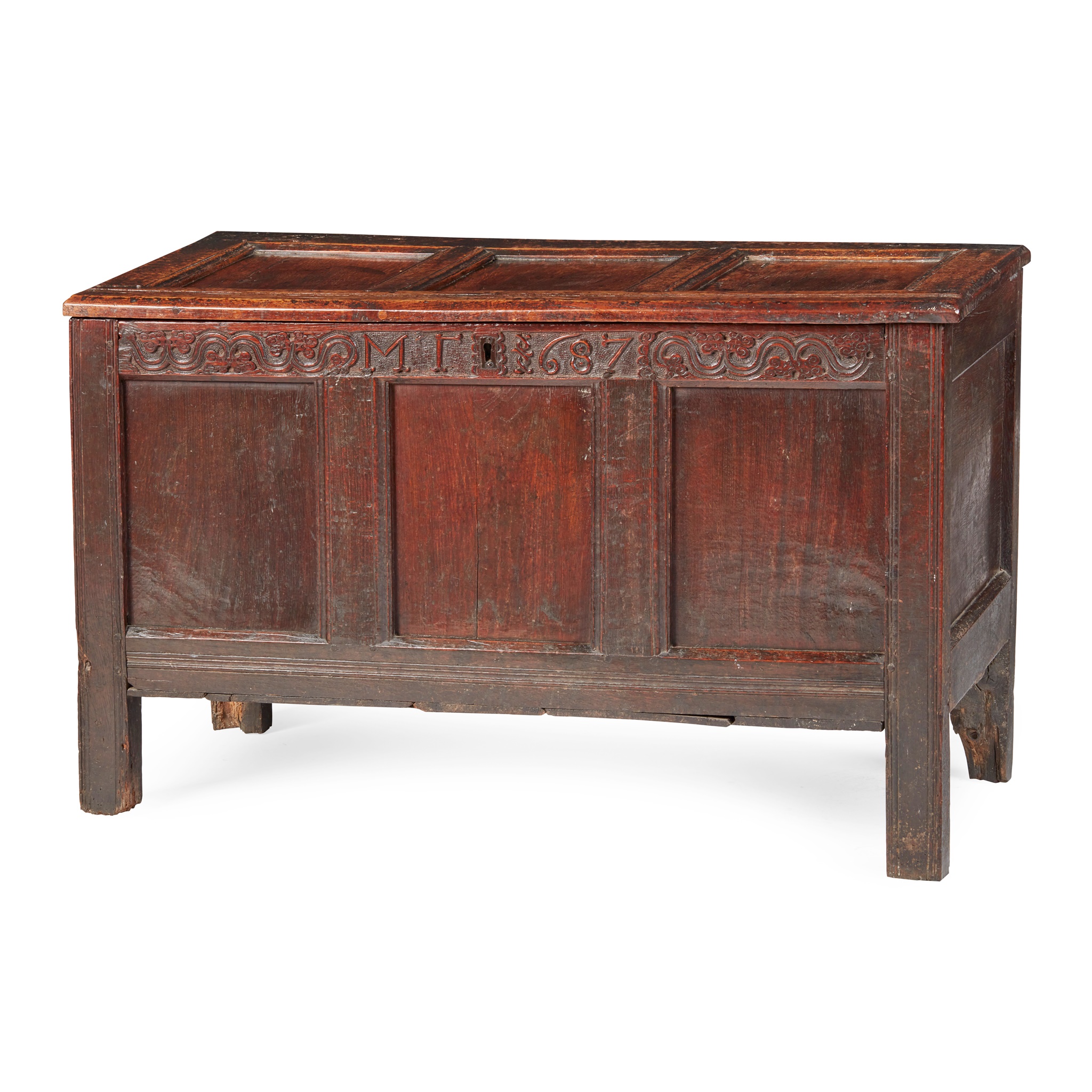 the hinged top opening to an interior with a later fitted locking compartment, the front panel with a foliate carved frieze and initials MT and dated 1687, raised on stile feet; bearing an old ivorine trade label