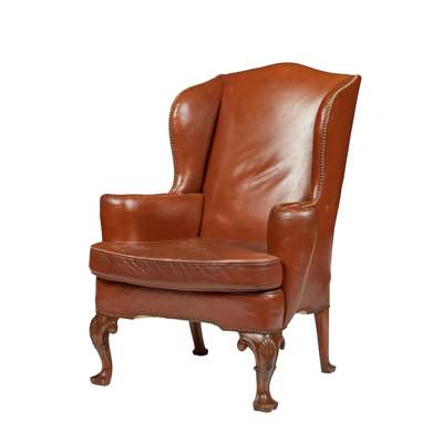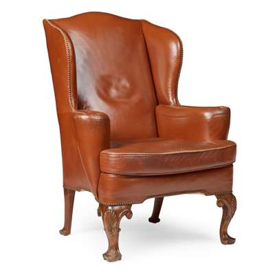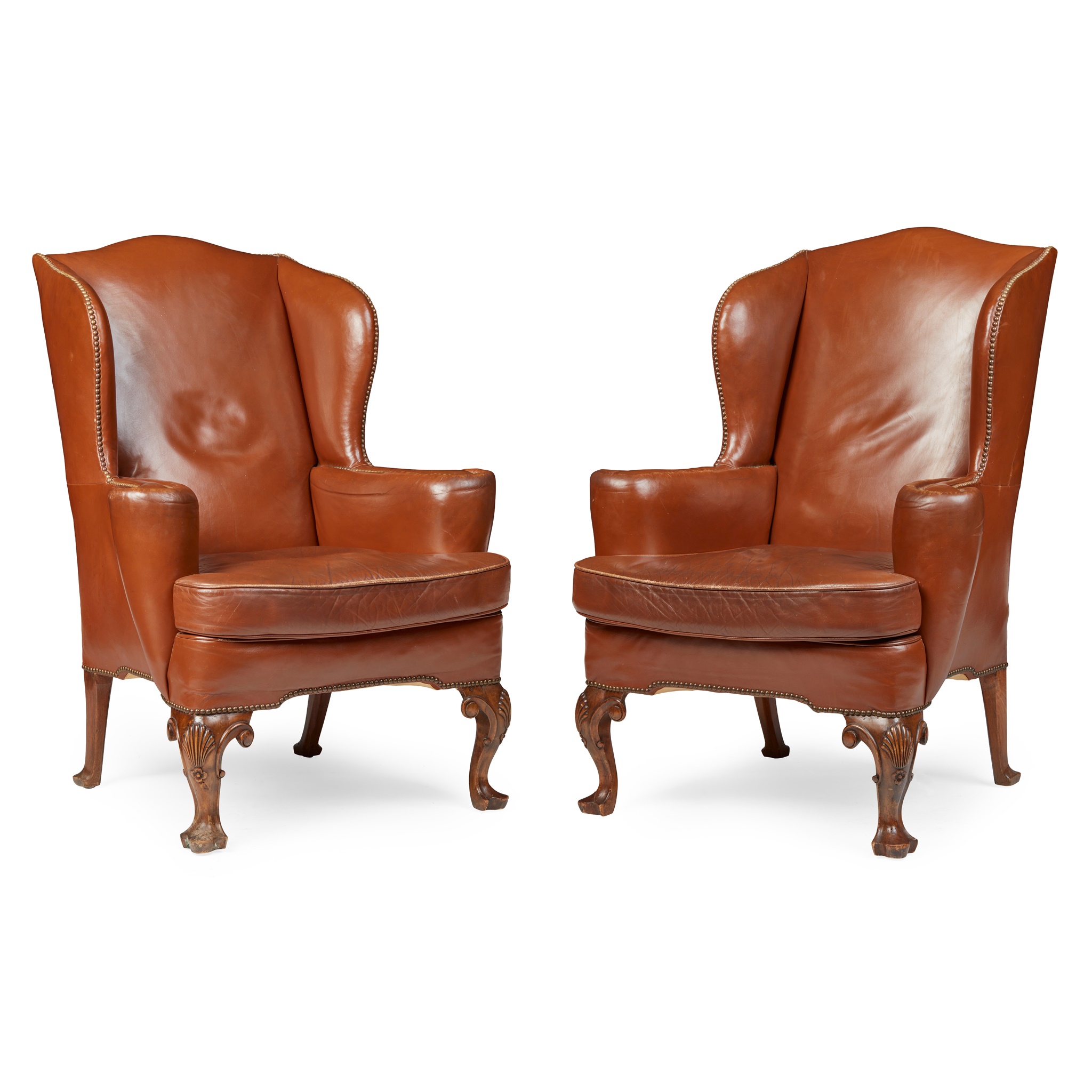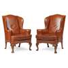 PAIR OF GEORGIAN STYLE BROWN LEATHER UPHOLSTERED WING ARMCHAIRS
