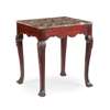 the grey and black marble slab top over a shaped frieze, raised on shell carved cabriole legs ending in square feet
