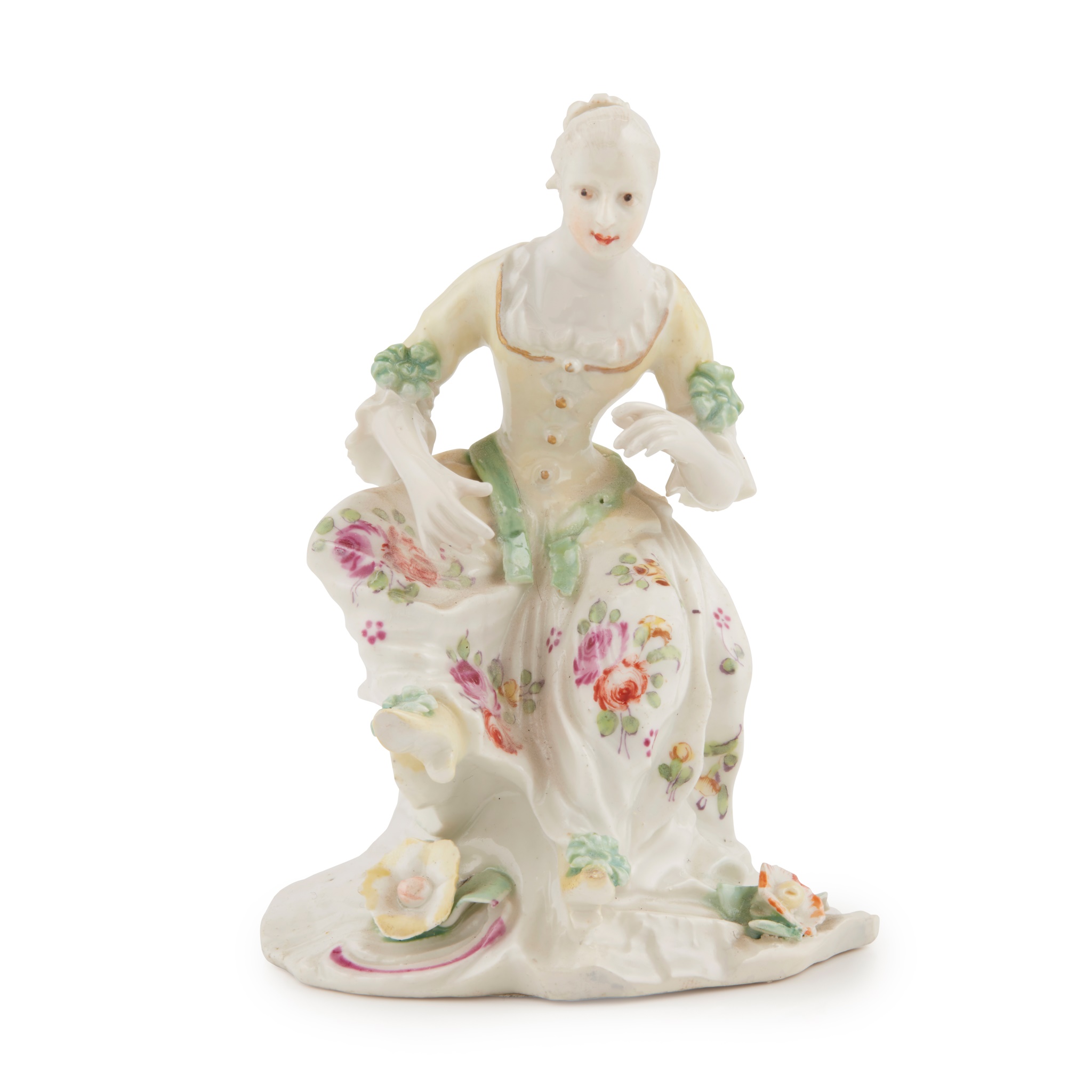 modelled as a seated lady with a pale yellow bodice and floral skirt, wearing green ribbons, on a moulded rocaille scroll base with applied flowers and foliage; Fry Collection: No 1 sticker to base, faint patch marks