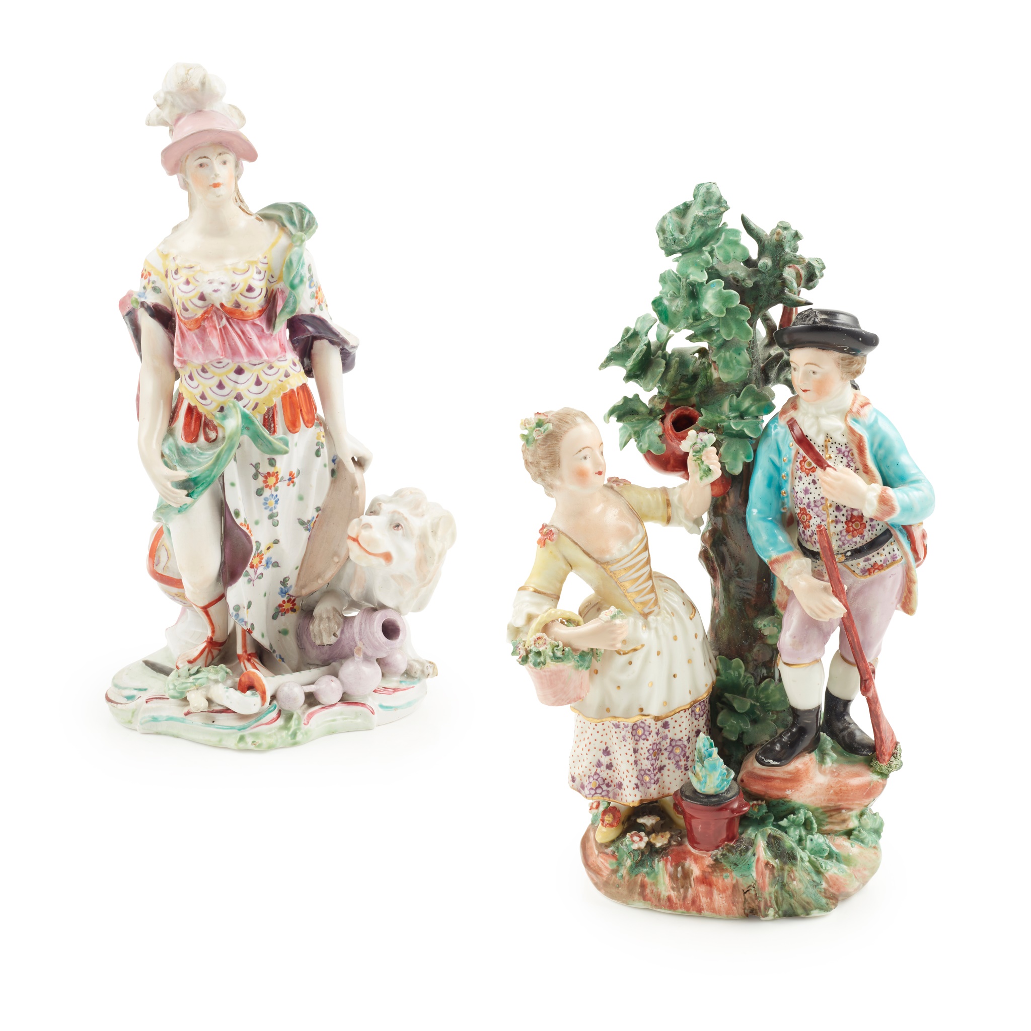 one modelled as Britannia standing alongside a lion and a globe, the attributes of war at her feet; on a moulded scroll base; Edward Knapper Collection sticker to the base, patch marks; the other figure modelled as a male hunter with a female gardening companion, her watering can hung in a tree; AJ & G Fry Collection sticker to the base, incised N 68, patch marks