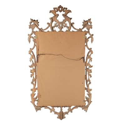 in the Chippendale style, the rectangular mirror plate surmounted by a C-scroll and acanthus cresting, the sides with C-scrolls, pendant foliage and acanthus leaves, the apron with opposed C-scrolls flanked by scrolled acanthus leaves