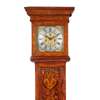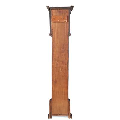 the hood with a flat moulded cornice above a square door, enclosing an 11 inch brass dial with silvered chapter ring with Roman numerals, subsidiary seconds dial, date aperture, and two winding holes, signed 'Nathaniel Birt, London', with pierced mask spandrels, above a walnut moulded trunk door with a circular lenticle, on a square plinth with moulding, all inlaid with figural and floral marquetry panels on ebonised grounds, the twin train movement striking a bell