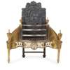 the arched cast iron fire back depicting Cupid astride an eagle and the date 17** with initials; above a three-bar grate flanked by punch decorated brass panels and urn finials, above a pierced foliate apron, raised on square tapered legs