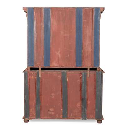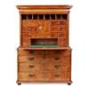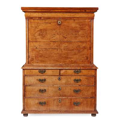 the moulded cornice above a cushion moulded frieze drawer and fall front, opening to an arrangement of drawers and pigeon holes and a baize writing surface; the lower part with two short over three long graduated drawers, on later bun feet