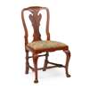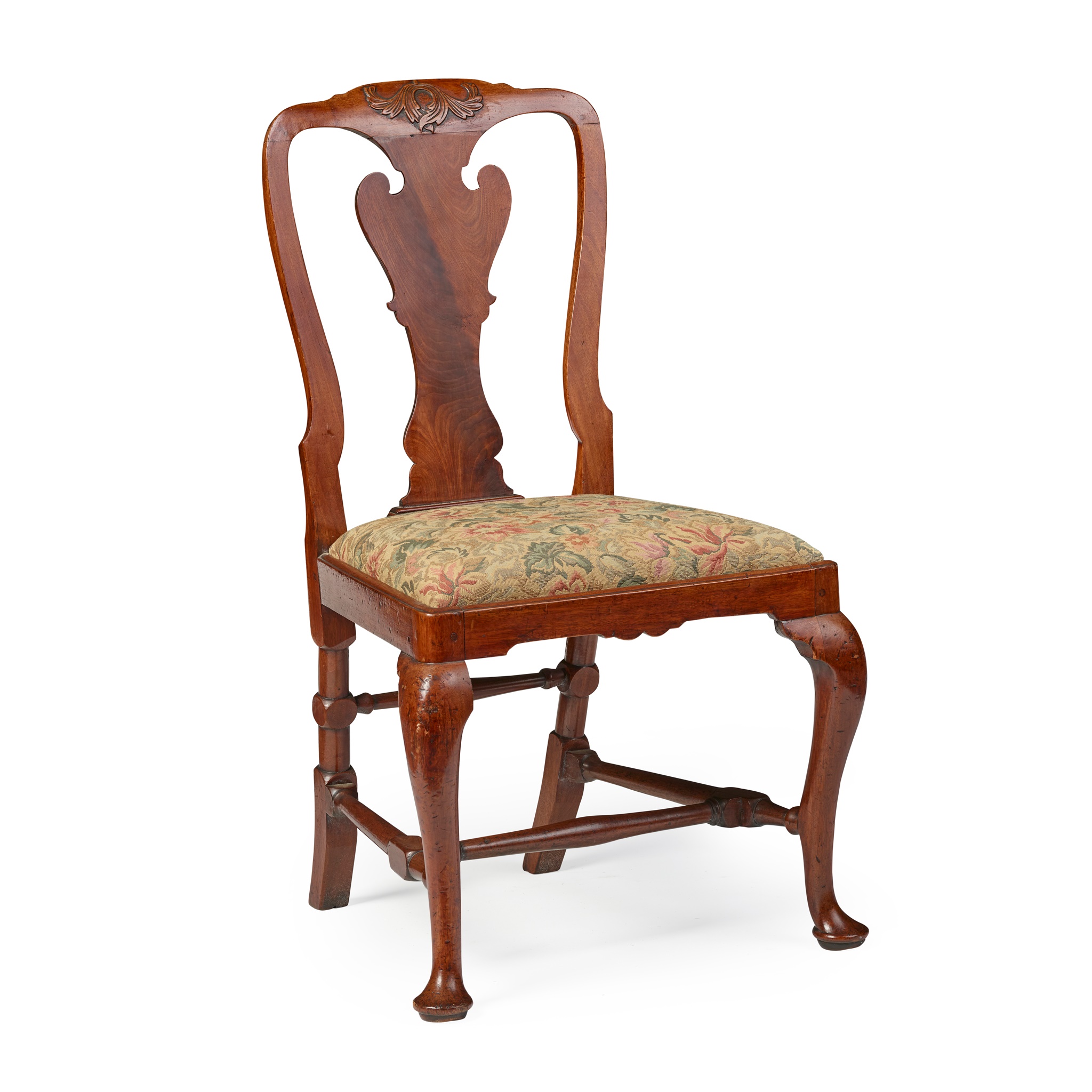 the arched toprail centrally carved with acanthus leaves over a vasiform splat, above a drop-in seat with plain seat rails, raised on cabriole legs united by turned stretchers and ending in pad feet