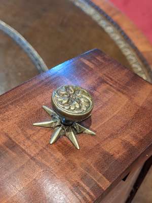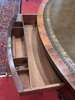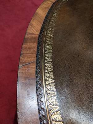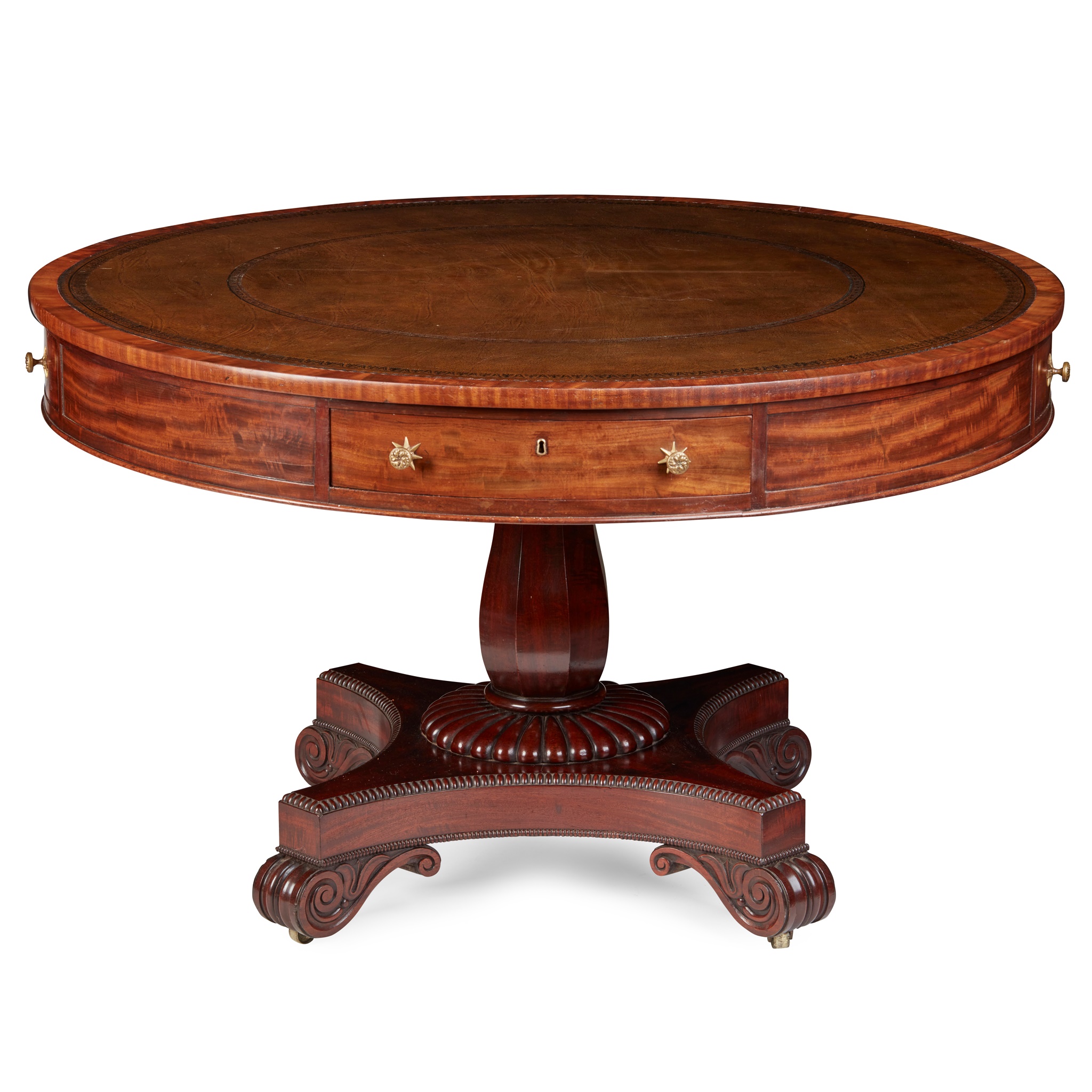the circular top with a gilt tooled brown leather insert above a frieze with four drawers, on a faceted baluster column and quadripartite base outlined with bead moulding and raised on scroll feet with brass castors