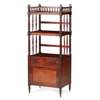 the spindle gallery top above two further platform shelves, the base with a drawer and cupboard, on turned feet with brass castors