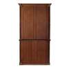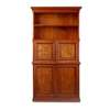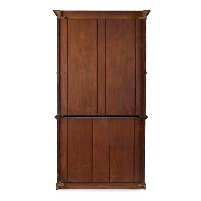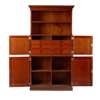 the moulded cornice above open shelves and a pair of panel cupboard doors enclosing six short drawers; the base with a further pair of doors enclosing shelves, on a plinth base