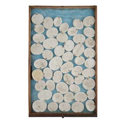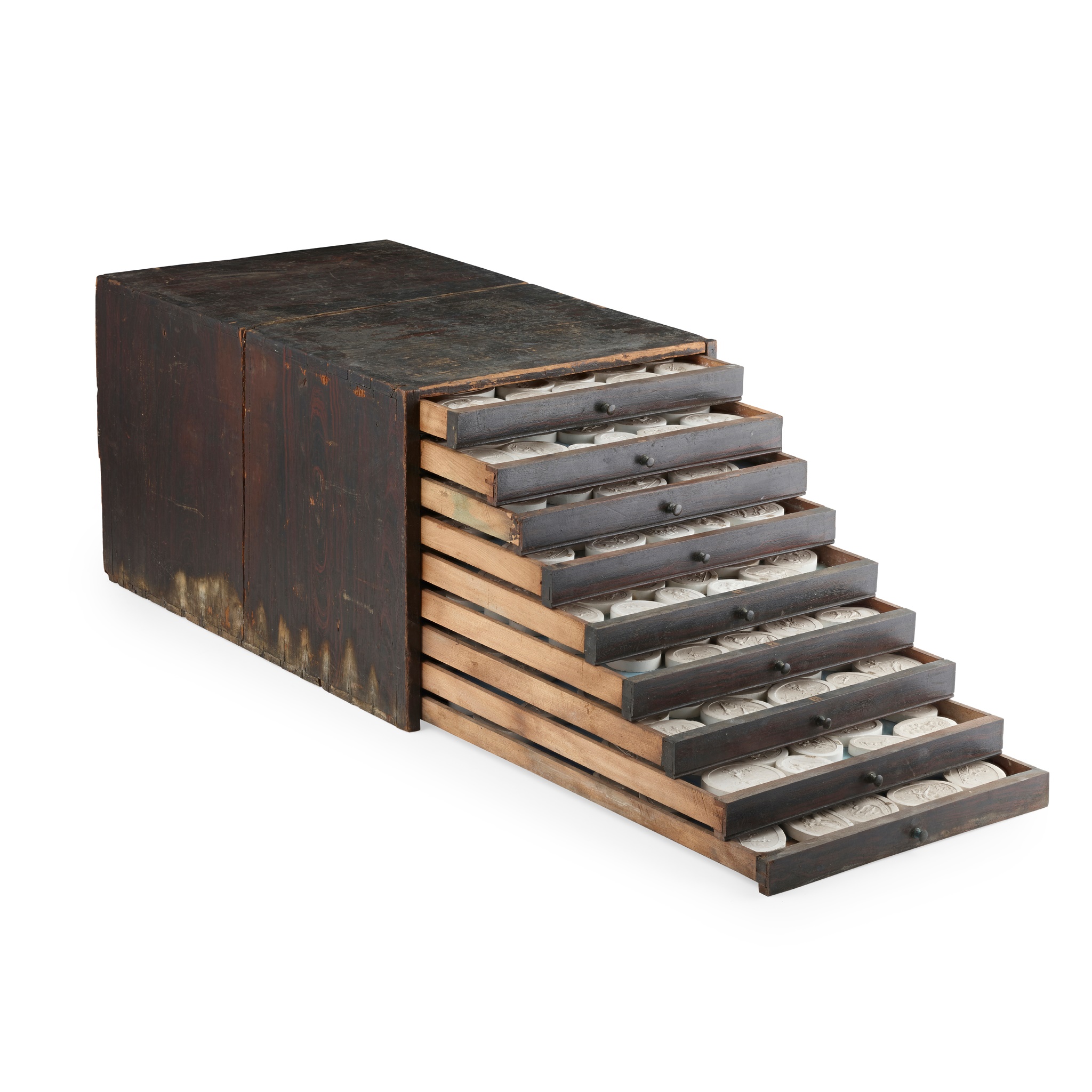 the pine box painted to simulate rosewood, with nine drawers containing three hundred and forty plaster oval intaglios of classical subjects
