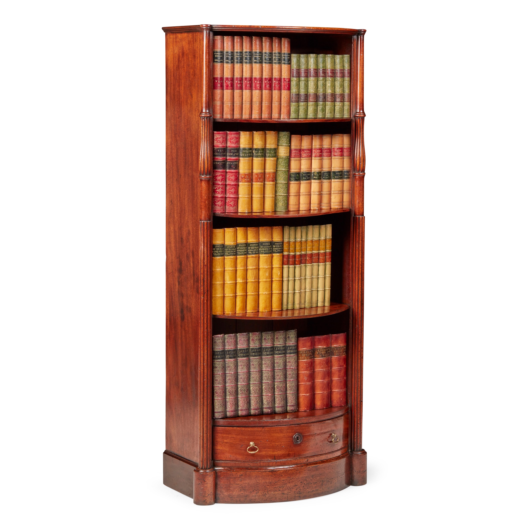 with four fixed shelves flanked by part-reeded columns, above a base drawer and conforming plinth