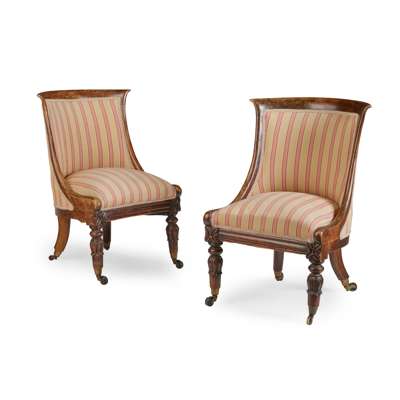 the curved backs and stuff-over seats raised on lotus carved and turned legs headed by foliate blocks, with brass caps and ceramic castors, covered in red and taupe ticking stripe fabric