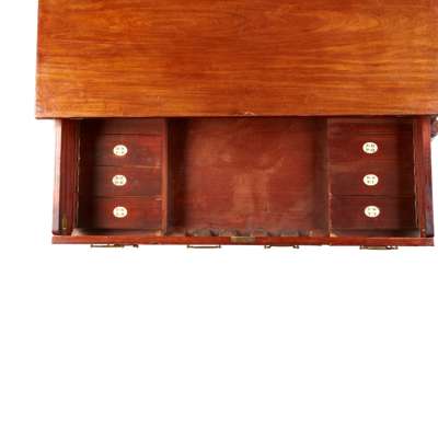 the double hinged and ratchet adjusted top with a reeded edge, above a secretaire drawer fitted with a green leather slide with a glass inkwell and ratchet adjusted slope, over a recess with covered compartments and hidden drawers, the hinged covers with ivory plaques inscribed with alphabet series, above an arched apron and raised on banks of three drawers and an arched apron, the corners with turned and reeded columns, the reverse with dummy drawers and cupboards, on castors; stamped twice on the drawer J. WARRINGTON