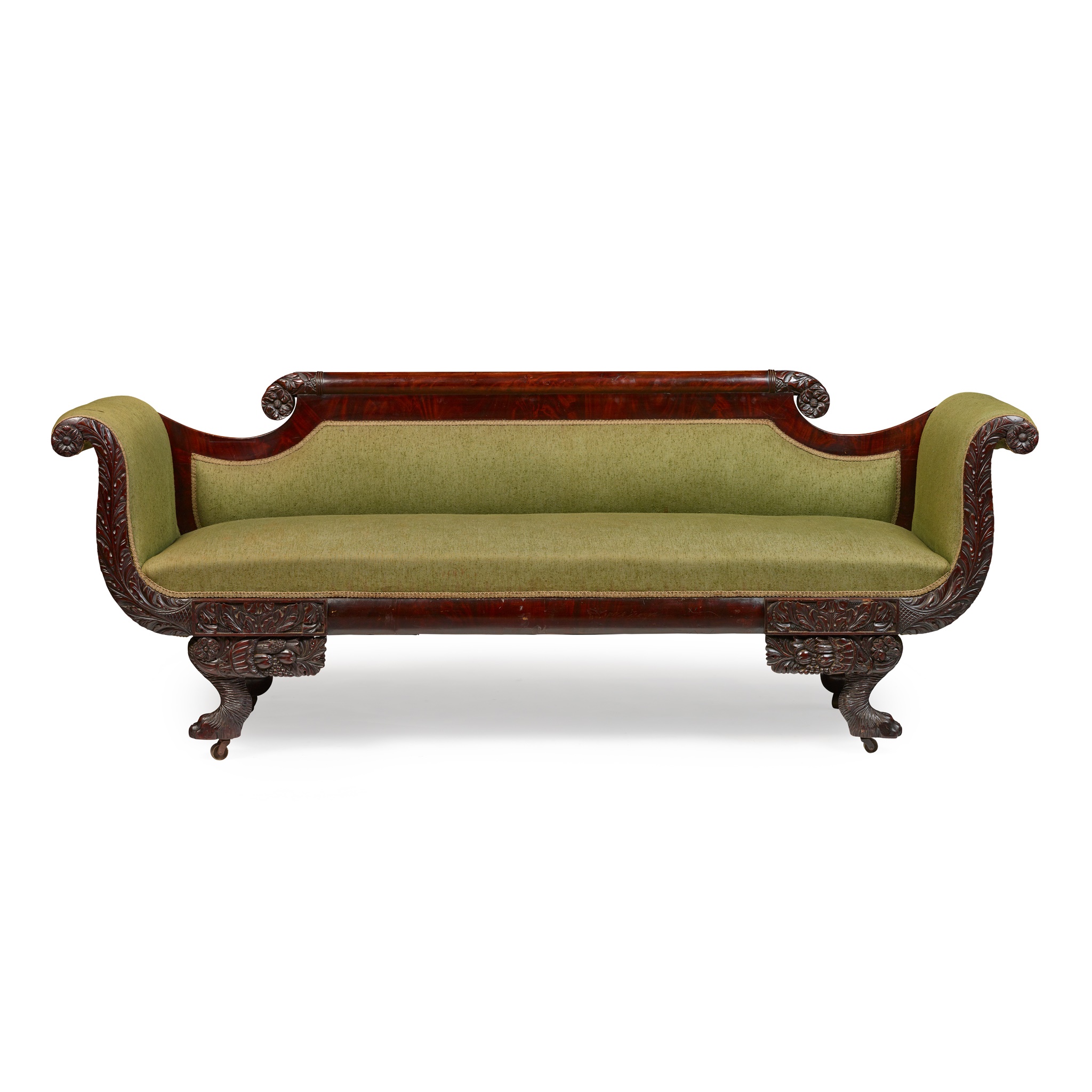 the serpentine shaped back with carved acanthus scrolls, above a long padded seat and high scrolled arms with carved acanthus facings, raised on carved paw feet with brass castors