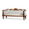 the padded back with a shell and foliate carved scrolling top rail, above a padded seat on a moulded seat rail flanked by upright arms with lotus carved facings, raised on short turned and reeded legs, in pale blue upholstery with two bolsters