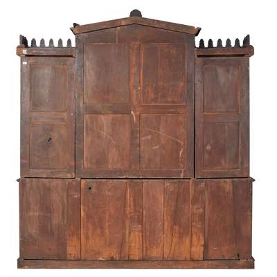 the arched cornice mounted with carved palmettes above leaf carved and moulded astragal glazed doors enclosing adjustable shelves, the breakfront base with a shallow secretaire frieze drawer flanked by short drawers, above panel moulded doors and scroll brackets, on a plinth base