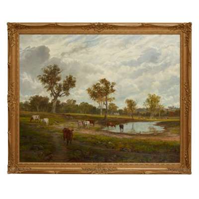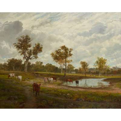 A PASTORAL SCENE WITH CATTLE WATERING BY A LAKE