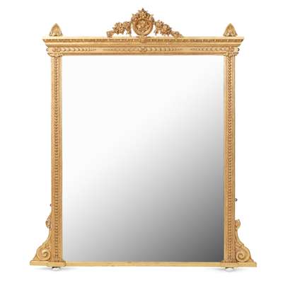 the rectangular mirror plate in a bead moulded frame with husk trails beneath an egg and dart moulded frieze surmounted by floral cresting and palmette finials