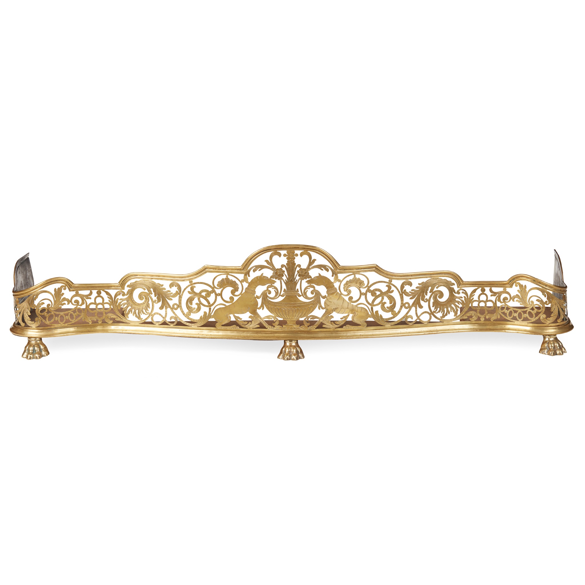 of shaped serpentine outline, the pierced brass panel depicting a pair of dogs flanking a flowering urn amongst leaf and C scrolls, raised on paw feet