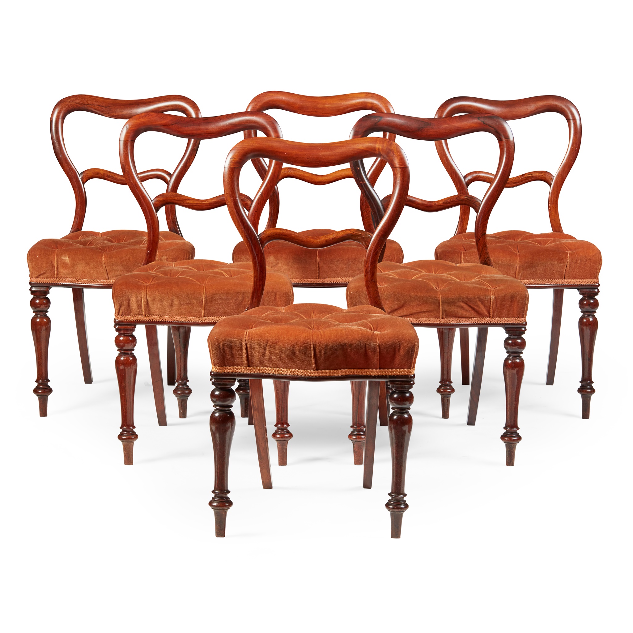 with open balloon backs with moulded top rails, above serpentine buttoned seats covered in burnt orange velvet, raised on turned legs