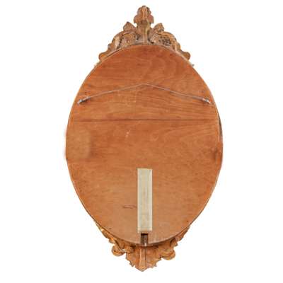 the oval mirror plates in moulded frames with pierced cartouche cresting, each issuing three scrolling candle arms