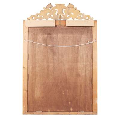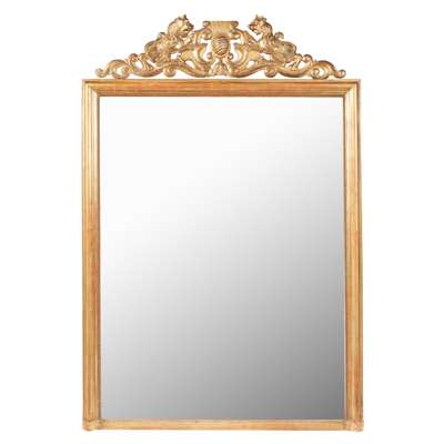 the rectangular mirror plate in a moulded and beaded frame surmounted by a carved armorial cresting flanked by lions