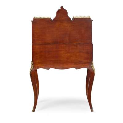 the superstructure with a central mirror flanked by a pair of glazed cupboards with pierced brass galleries, above a slope enclosing a fitted interior with pigeon holes, drawers and a well above a shaped frieze, raised on cabriole legs, with gilt metal mounts throughout