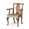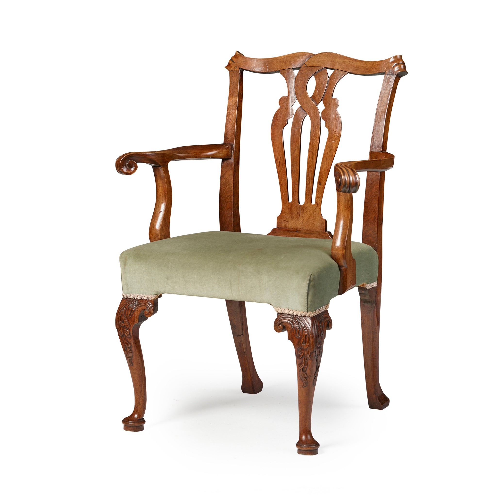 the shaped top rail carved with scrolled ears, above a pierced interlaced splat and pale green velvet stuff-over seat flanked by scrolled arms with scrolled hand terminals, raised on acanthus carved cabriole legs ending in pad feet