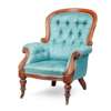 the buttoned spoon back and enclosed arms above a stuff-over seat in turquoise jacquard upholstery, raised on lotus carved legs ending in brass caps and castors