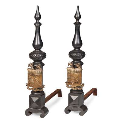 Note: Designed by Thomas Duff for Parkanaur House, Castlecaulfield, County Tyrone for John Ynyr Burges and Lady Caroline Burges. Duff designed Parkanaur in the Tudor-Revival style to expand the existing Edenfield Cottage, with building commencing in 1839. These andirons were made to complement the Duff-designed fireplace in the drawing room, which also featured the Burges coat-of-arms.